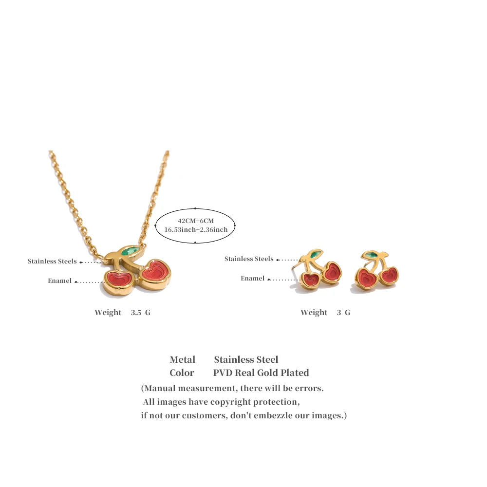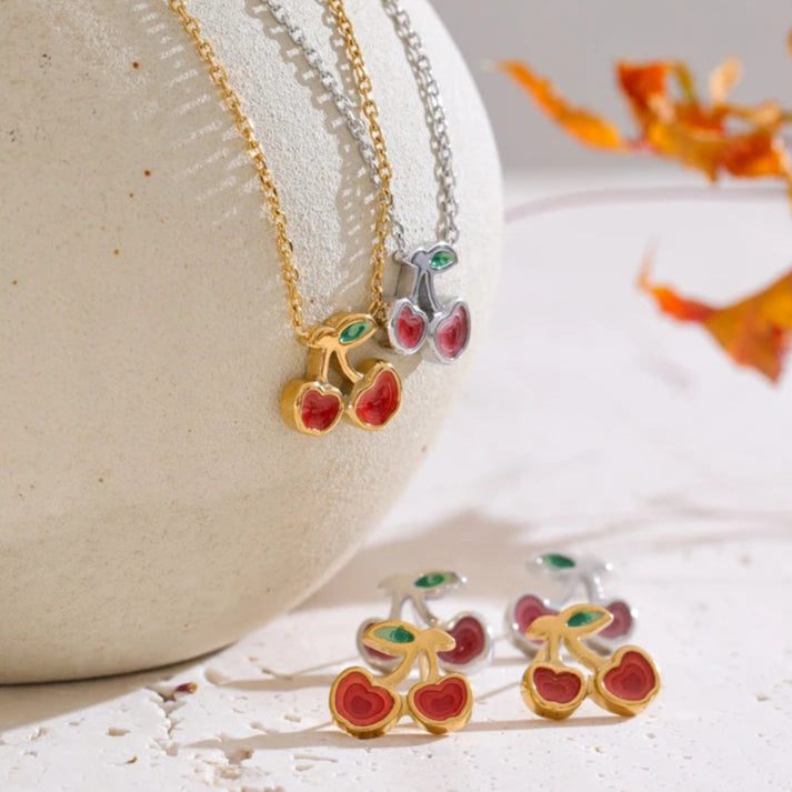 The Cherry Sweethearts set is inspired by the golden age of 1950s youth culture — a time when British girls twirled in tea dresses and American pin-up icons posed with cherry-printed scarves and bold accessories. This jewelry set captures the transatlantic spirit of playful femininity, youthful romance, and summertime joy.