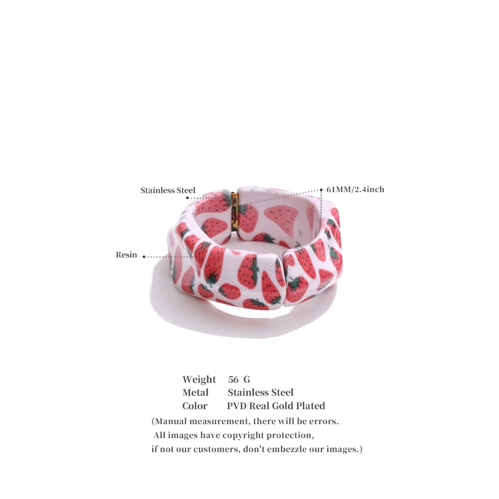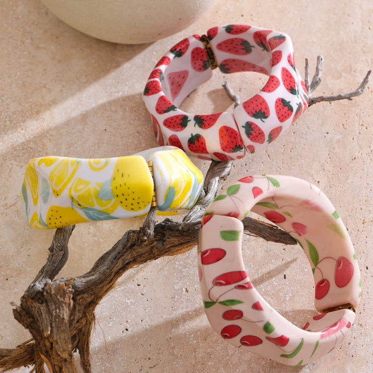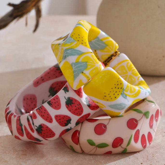 The 1960s in Britain was a golden era of vibrant colors and bold design. The Mod Fruit Parade bangle, featuring bright strawberry, pineapple, and cherry motifs set in a wide resin band, perfectly captures the iconic Mod style and daring color palette of the decade.