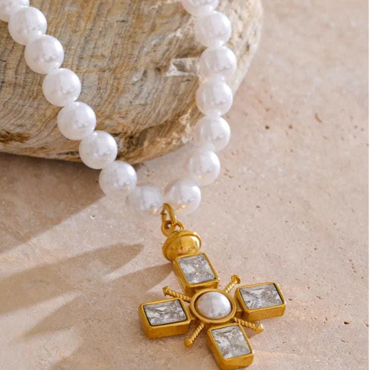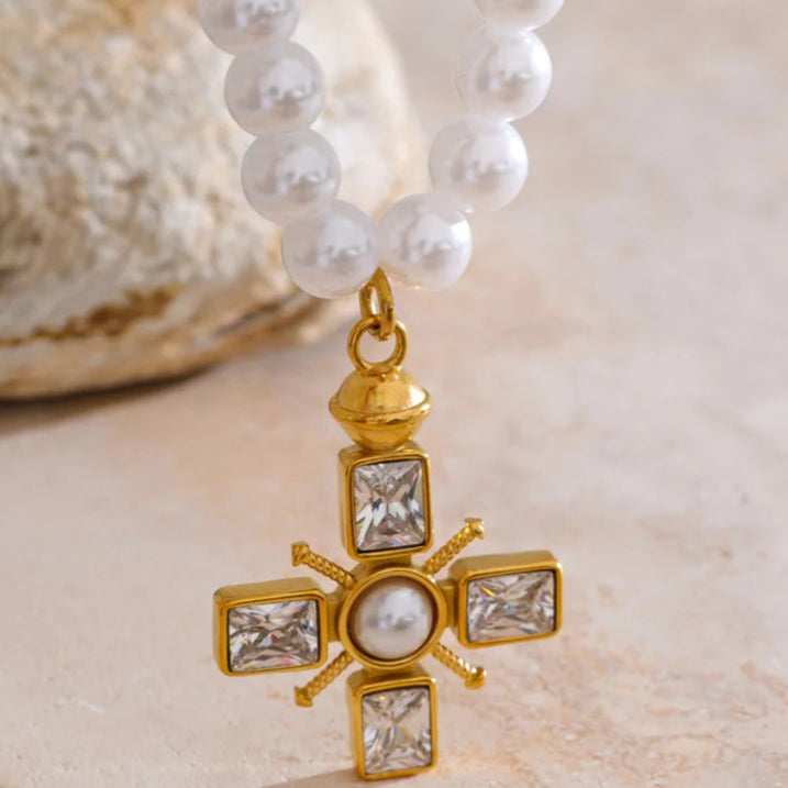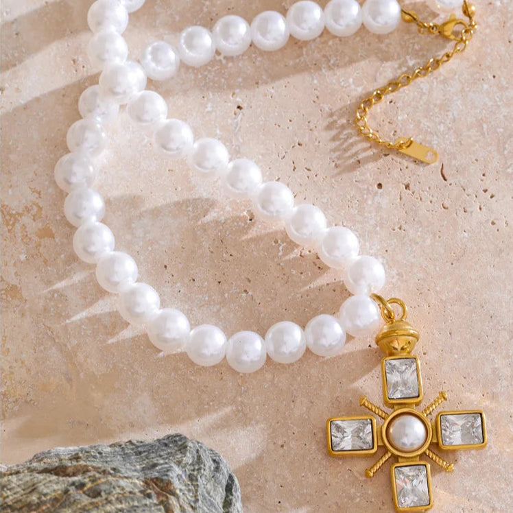 Inspired by the post-war elegance of the 1950s, Chapel Pearl captures the grace of a quiet Sunday morning. Women of the era dressed in their finest to attend service, often wearing pearls as a symbol of purity and dignity. The delicate cross charm reflects the gentle faith carried through generations, while the lustrous simulated pearls add a soft glow of femininity. This handmade piece is a poetic tribute to love, tradition, and divine beauty.