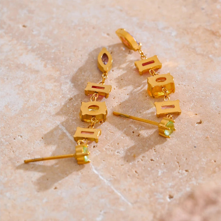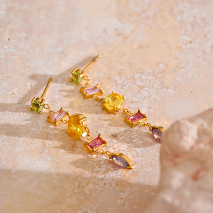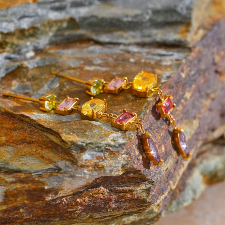 In the 1950s, a woman’s elegance shined brightest in moments of subtle sparkle. These earrings cascade with colorful cubic zirconia, capturing light like a gentle waterfall of glamour. Perfect for evenings when sophistication meets charm.