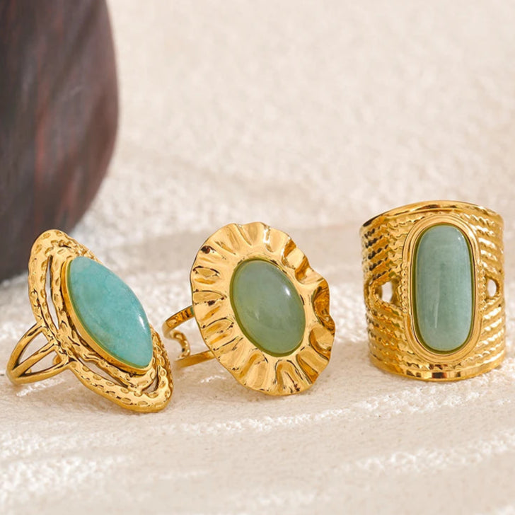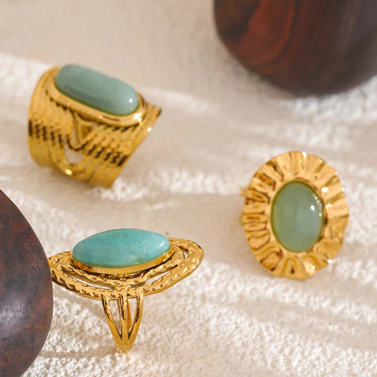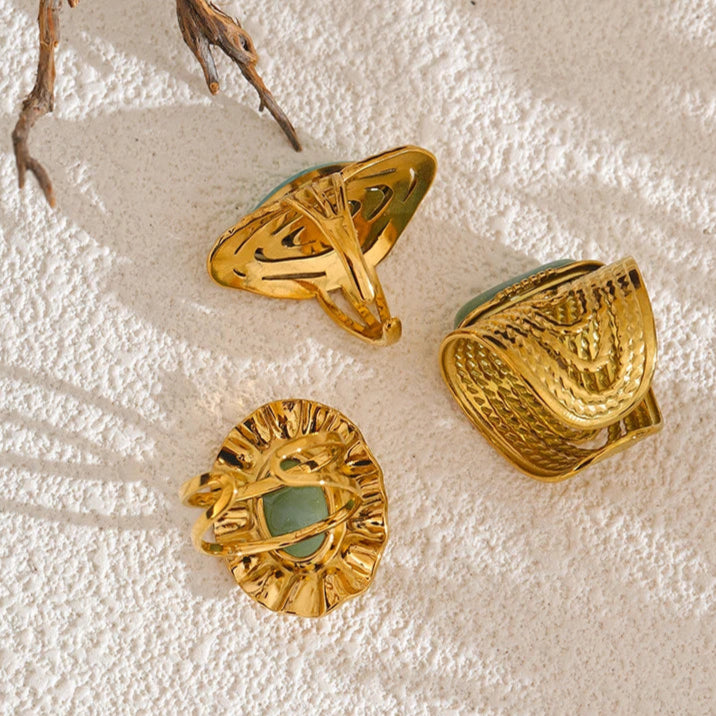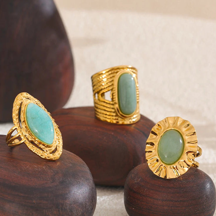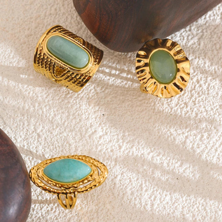 Crafted with a pure green natural stone and an adjustable open ring design, Vintage Lagoon embodies the flexible and courageous spirit of 1970s women breaking free from conventions. Whether attending art salons, weekend markets, or daily office life, this ring served as a subtle yet confident accessory that expressed their elegant resilience and layered strength during this era of transformation.